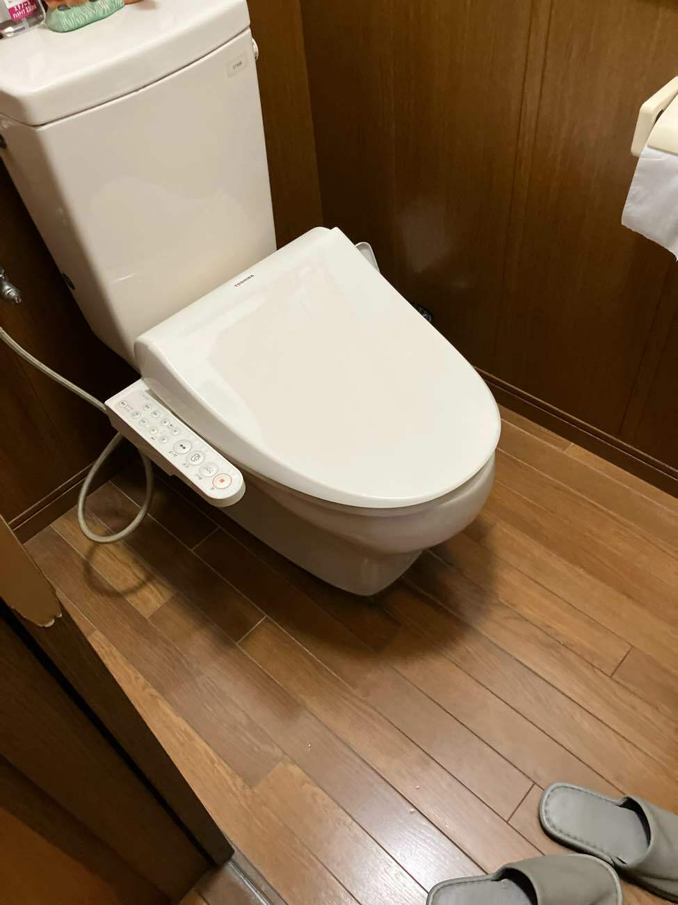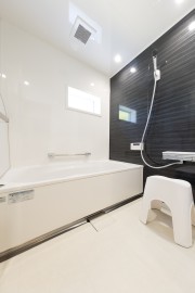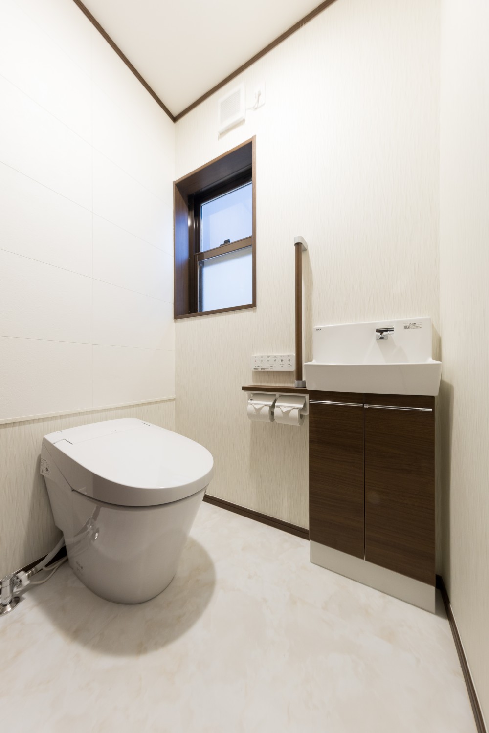 2世帯でお住まいのU様邸では、誰もが気持ちよく使える空間を目指し、トイレの床にはお手入れがしやすく清潔感を保ちやすいフロアタイルを採用。さらに、背面には調湿壁材をあしらい、消臭・調湿効果をプラスしました。